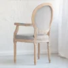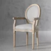 The classic French country style Olivia Dining Chair with Armrests is the epitome of calm, old-world elegance. Featuring a solid wood frame with carving detail and a brushed and lime-washed finish, distinctive medallion back, and padded fabric upholstery, this charming piece combines style, quality, and craftsmanship. Ideal both as a comfortable dining chair and an elegant occasional chair.