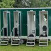 This is a luxury portable toilet trailer, also known as a mobile restroom or a mobile ablution unit. These units are typically use for events or construction sites where permanent sanitation facilities are unavailable.