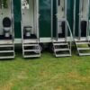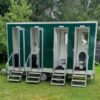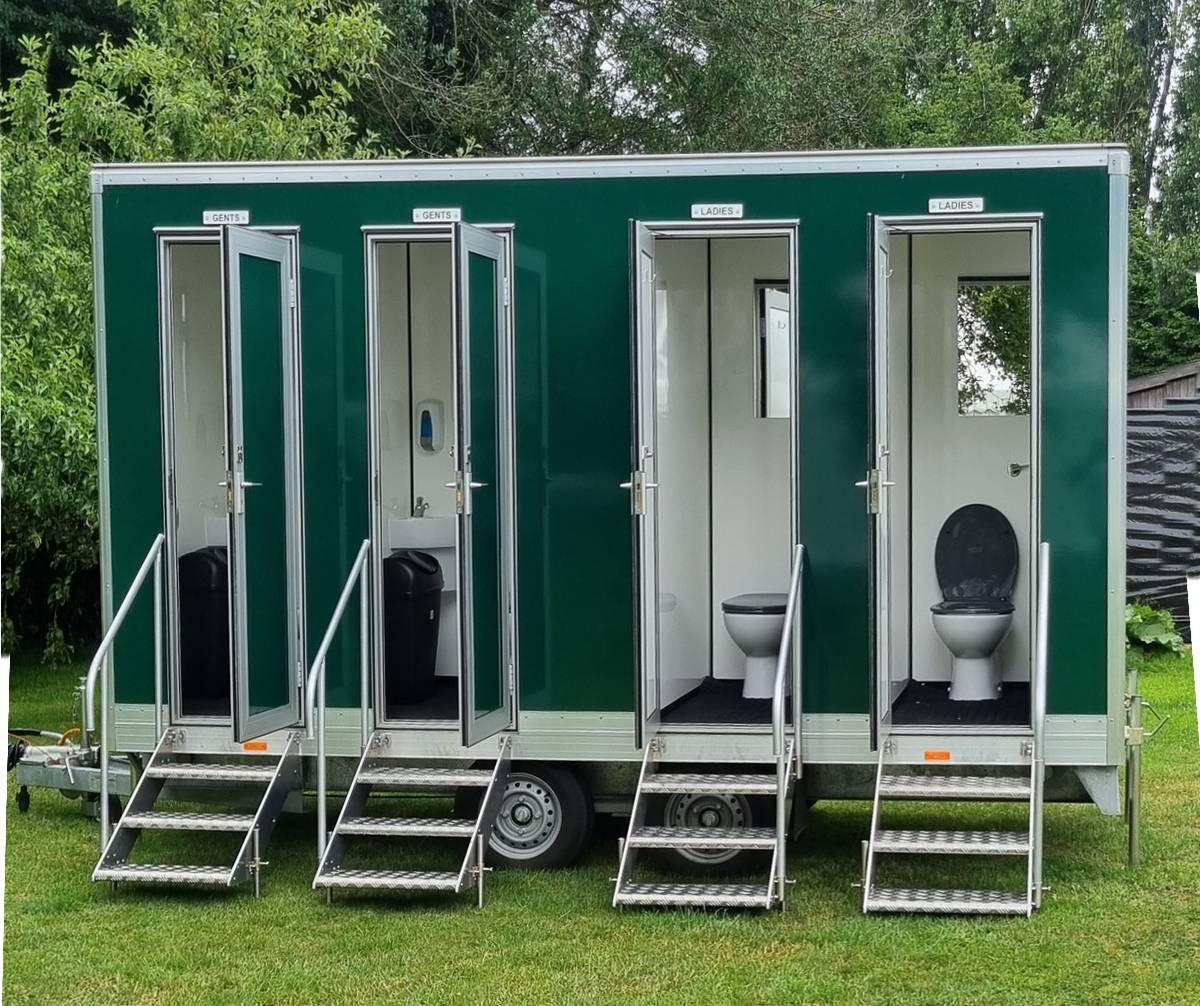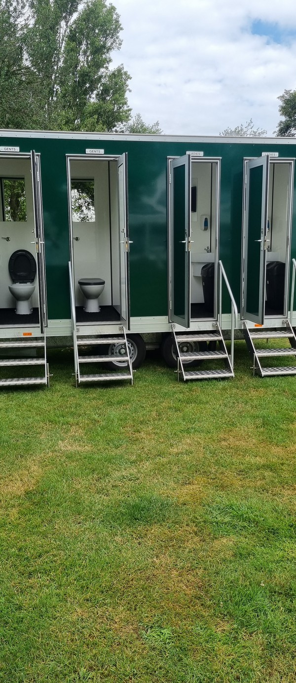 The unit is a self-contained luxury toilet trailer, designed for events where permanent facilities are unavailable. It is fully equipped with all necessary internal plumbing and integrated waste and water tanks, requiring only an electrical supply to operate.