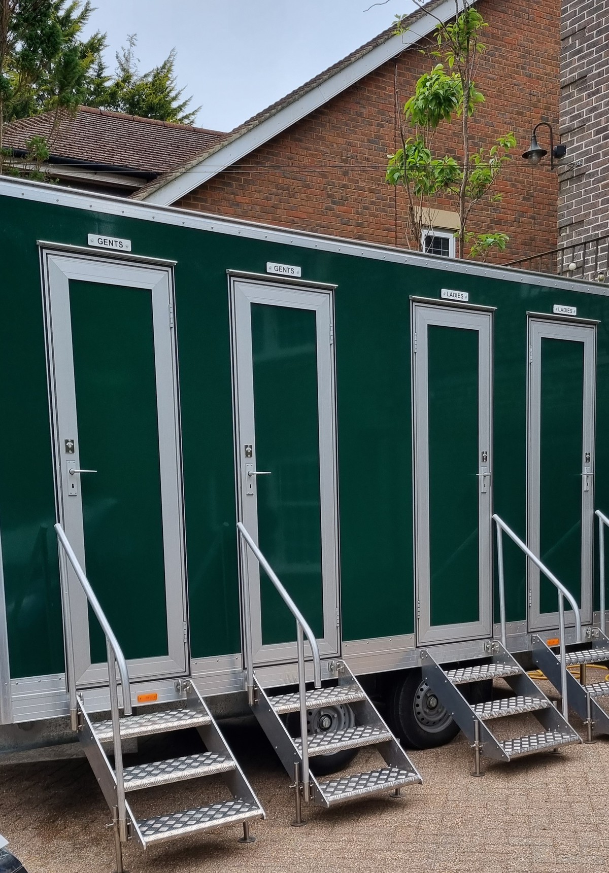 The unit features four separate cubicles: two for “Gents” and two for “Ladies”. The Gents’ side includes toilets and sinks, while the Ladies’ side provides toilets, sinks, and vanity mirrors. All cubicles have porcelain fixtures and interior lighting, offering a high-specification solution for various events.