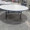 6 foot round banquet tables are 180 cm in diameter (72 inches) and stand 73.5cm high. They seat 10-12 people comfortably