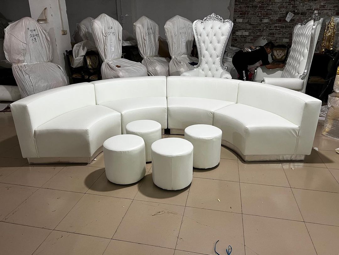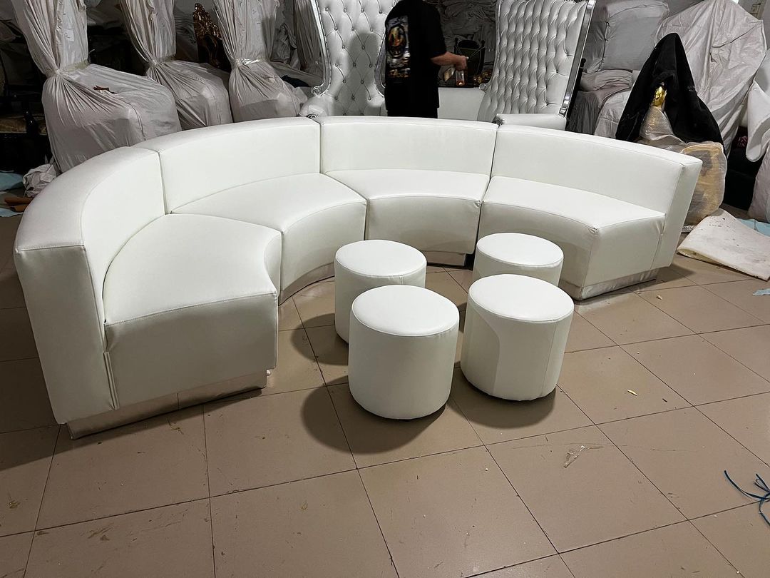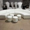Round white white ottomans, not a table, which often complement a modular curved sofa set. These versatile pieces of furniture are commonly used for additional seating, as footrests, or, with a tray, as an accent or side table.